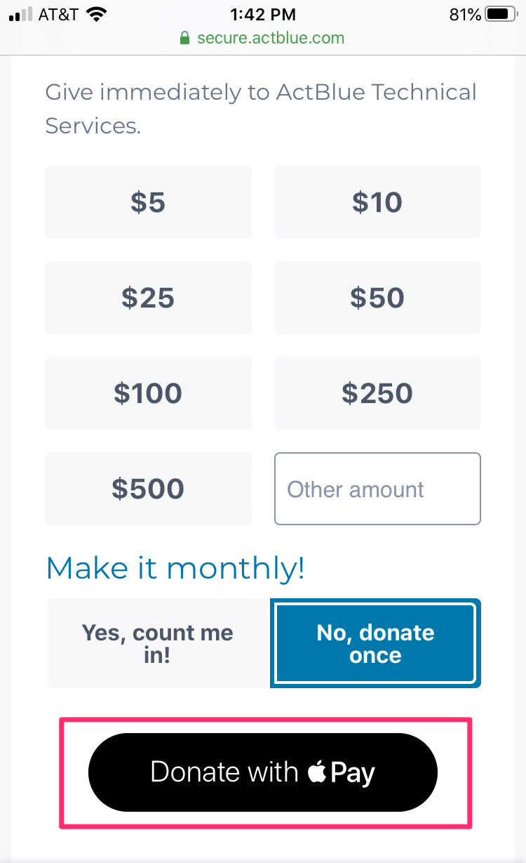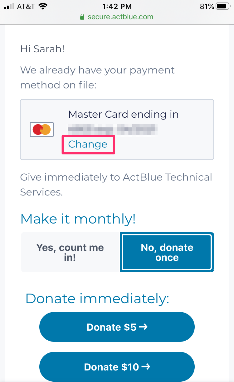 If you are signed in to an ActBlue Express account with saved payment information, your payment method will appear as a single-click donation option. Use Apple Pay® instead by clicking “Change” under your saved payment method.