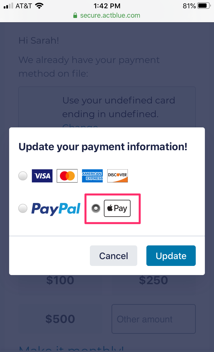 A pop-up will allow you to select Apple Pay to make your donation. Click Apple Pay and then the “Update” button.
