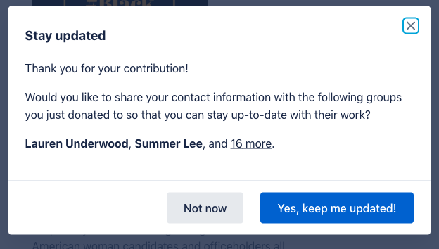 Changing this setting will show donors a pop-up box asking them to share their information after donating. The pop-up looks like this: