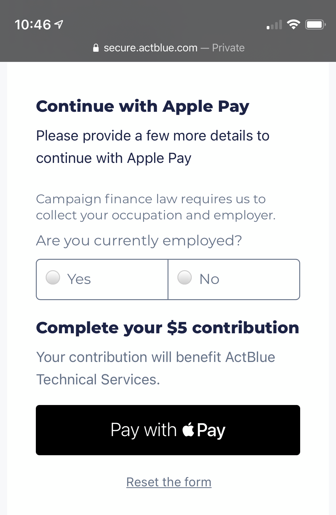 After clicking the Apple Pay button, provide additional information for campaign finance requirements and complete the donation.