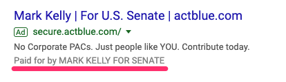 ActBlue does not run ads on behalf of any campaign or organization. Campaigns and organizations might run ads on third-party services like Google, Twitter, and Facebook. Groups can create ads that link to their ActBlue contribution forms (which is why the ad may show “secure.actblue.com” at the bottom); ActBlue is not responsible for and does not pay for these ads. A “Paid for” disclaimer under the ad will state who is running the ad.