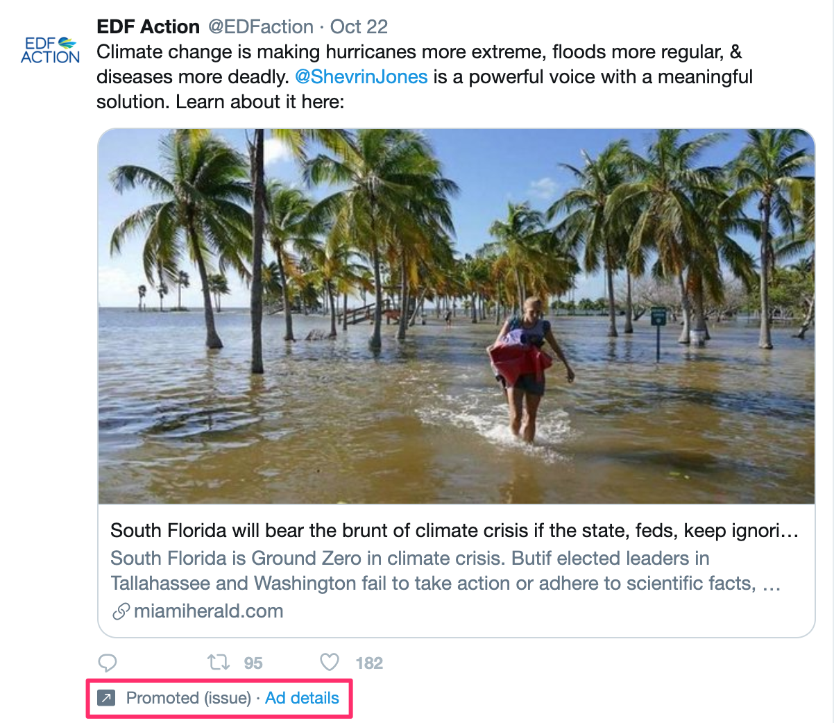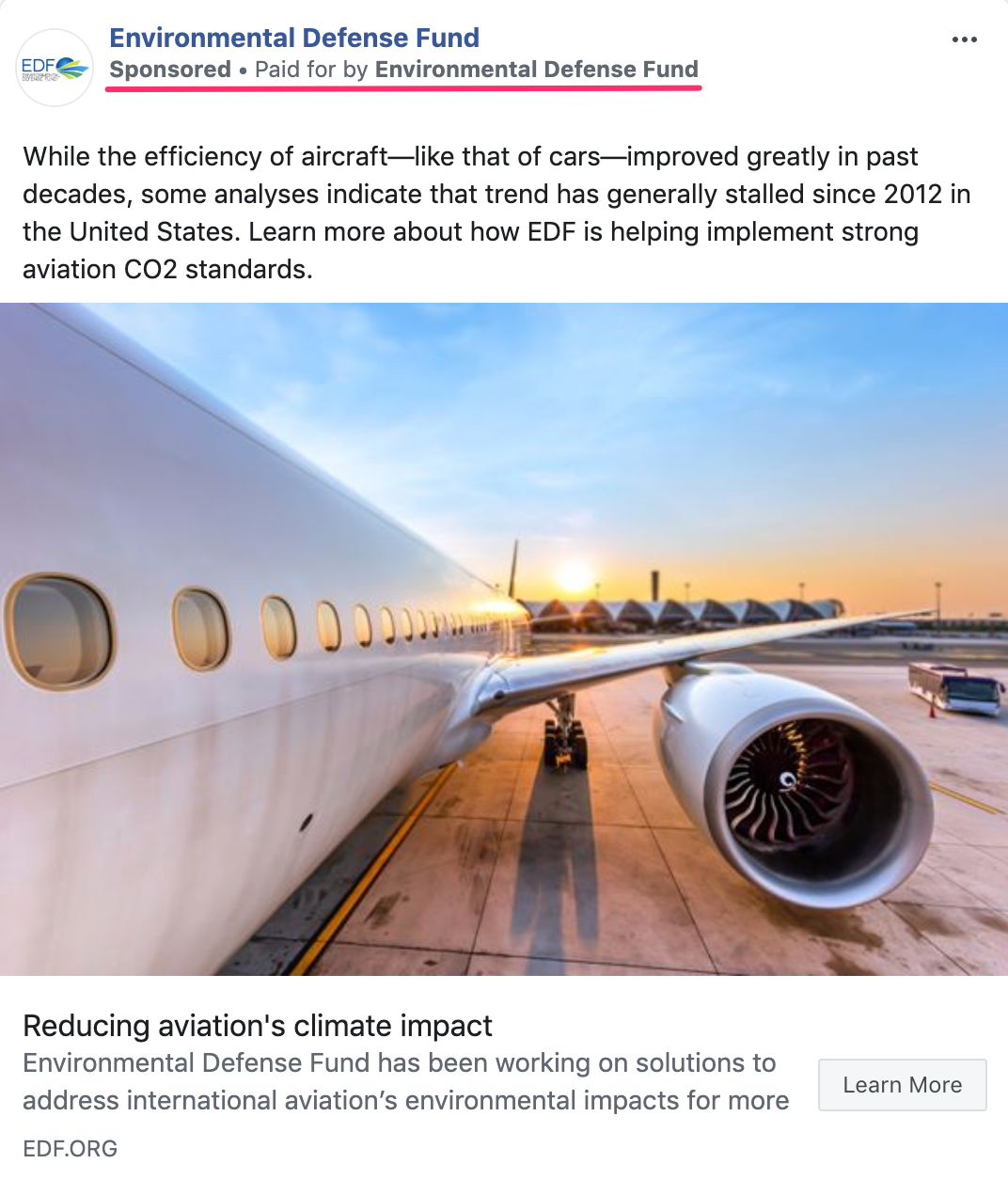 Facebook ads state the group paying for them next to the "Sponsored" disclaimer at the top, and Twitter ads have a “Promoted” disclaimer at the bottom.