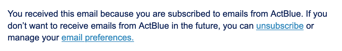 You can unsubscribe from ActBlue’s email list by clicking the “unsubscribe” link at the bottom of an email from us.