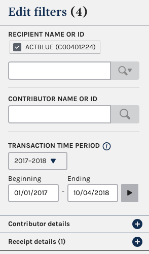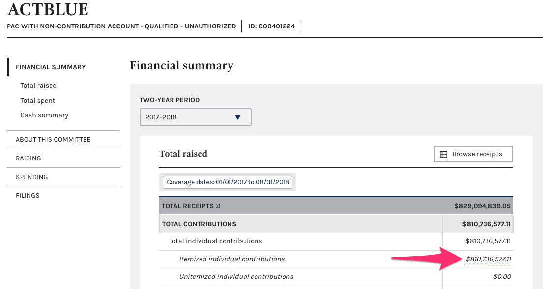 Go to the ActBlue committee overview on the Federal Election Commission’s website. On the “Financial summary” page, click the link for “Itemized individual contributions” (the underlined dollar amount on the right).