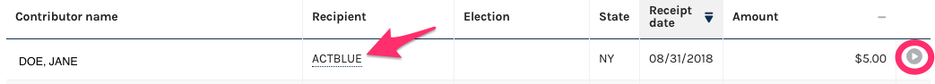 You will land on a page of individual receipts. The “Recipient” column lists ActBlue because of our conduit structure. To see which campaign or organization a contribution is going to, select the gray arrow to the right of the dollar amount.