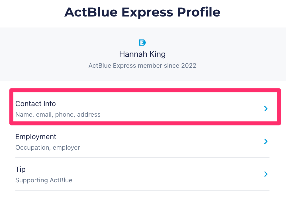 Log in to your account, click on the “Account” button in the top right, and choose “ActBlue Express Profile” from the dropdown.