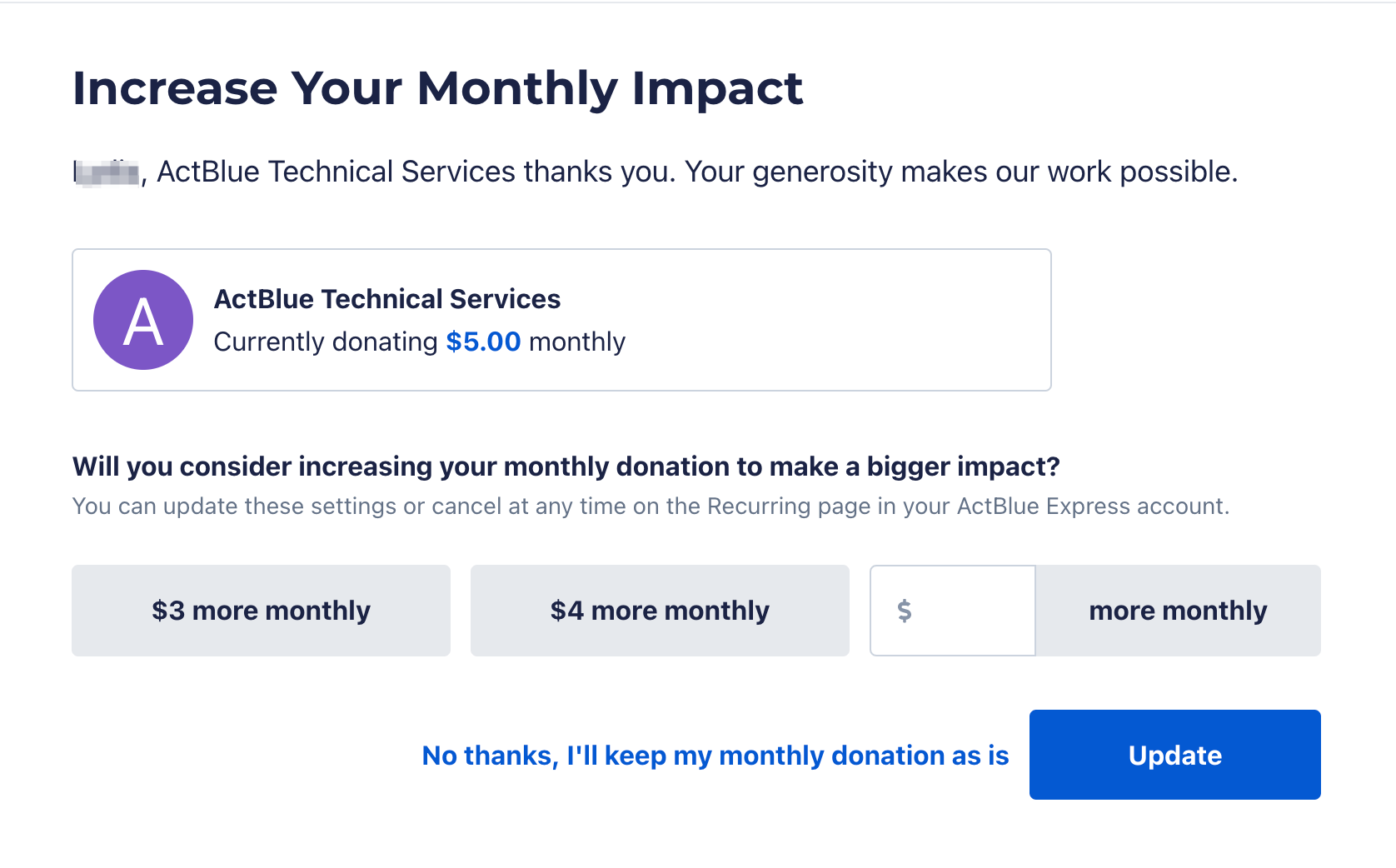 A monthly donation is an impactful way to show your support. To increase your monthly donation from your ActBlue Express account, log in and use the Recurring tab to update the dollar amount of your recurring donation .