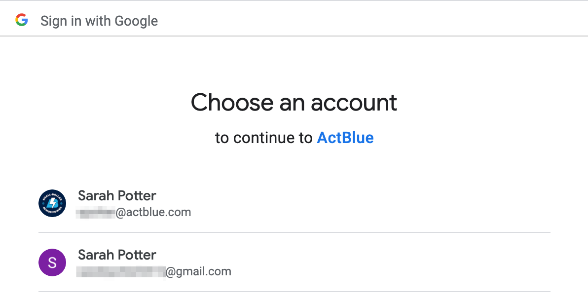In the pop-up, select the account you use to sign in to ActBlue. If you only have one Google account, you will still get a pop-up confirming the email account you would like to log in with. If you have multiple Google accounts, select the one affiliated with an ActBlue account!