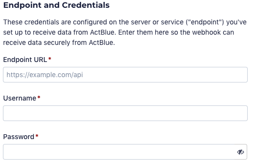 The “Endpoint URL” is where you’d like ActBlue to send your contribution data, and it needs to be a secure URL that begins with “https://”