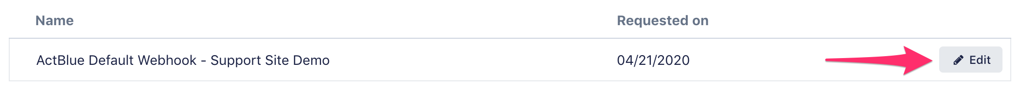 Once your vendor has submitted the webhook request, it will appear on the ‘Webhook Integrations’ page of your account, under Requested. Click “Edit” to view the integration details.