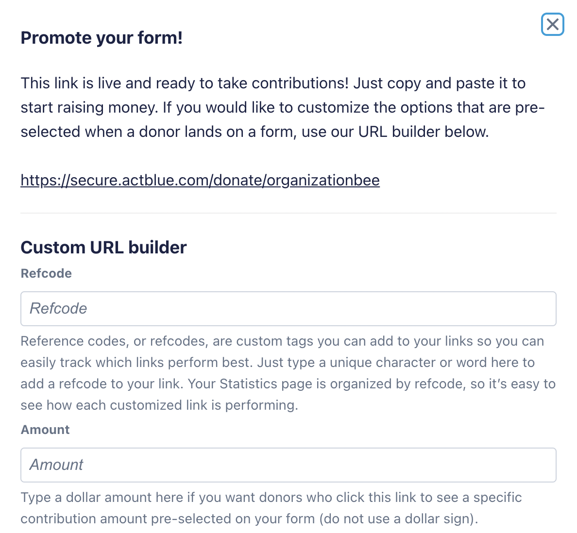 To use your custom URLs, copy the link in the pop-up and add it to your fundraising emails or website.