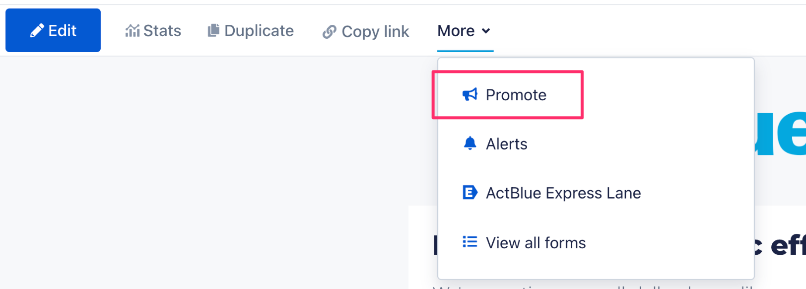 Under the “More” dropdown in the navigation bar at the top of your screen, select “Promote.”