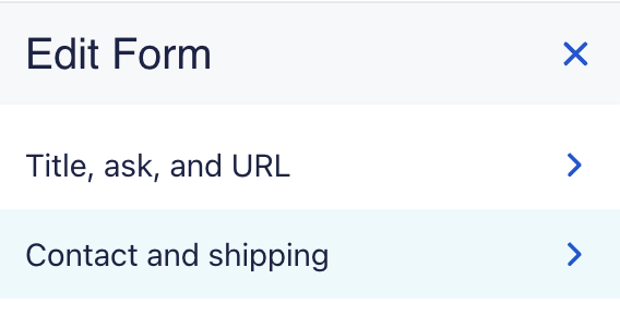 From here, you can add or edit your merchandise form's title, link, and donation ask by clicking on the Title, Ask, and URL tab: