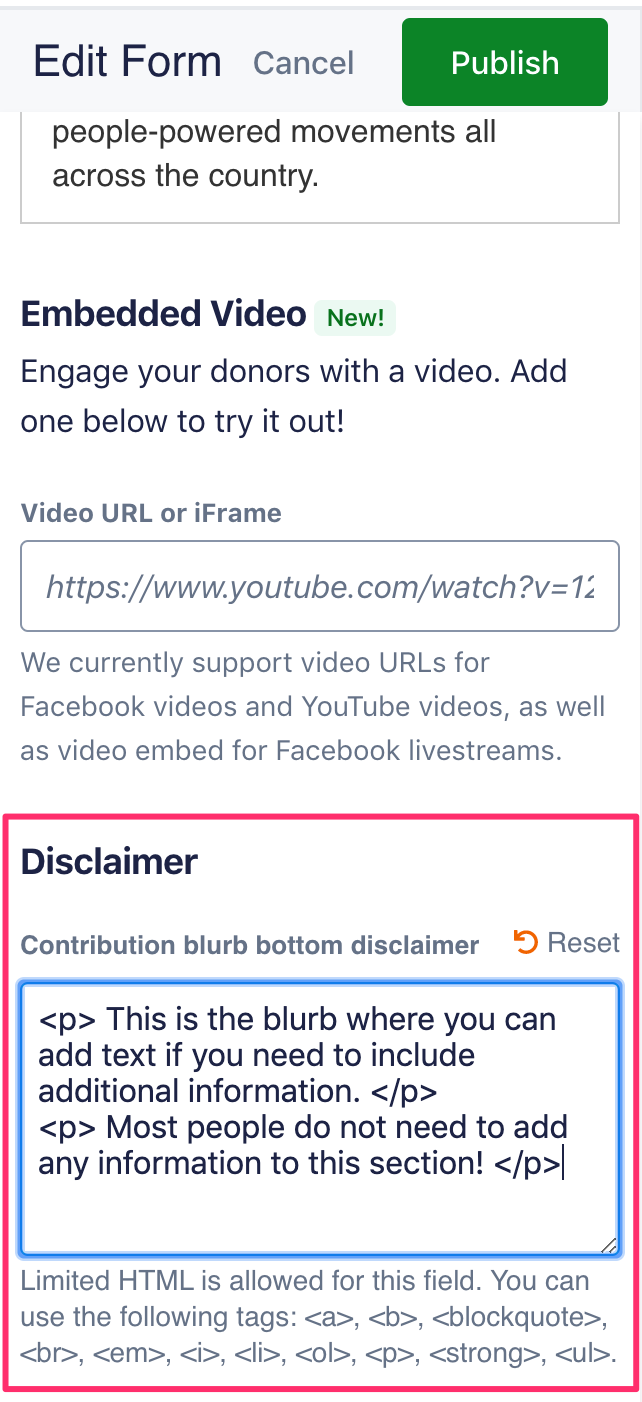 At the bottom of the “Title, ask, and URL” tab of the form editor, you can find the “Contribution blurb bottom disclaimer” section, where you can add additional information. You will also find tips about the HTML you need when filling out this section. For example, <p> tags are necessary for delineating paragraph breaks.