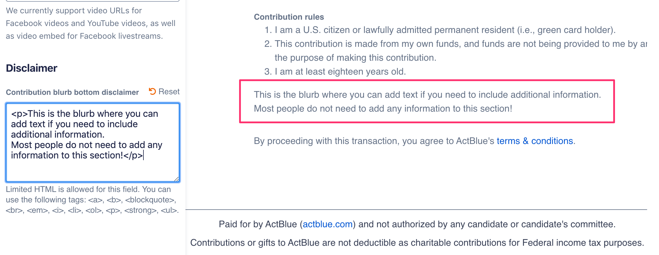 Every ActBlue form includes contribution rules at the bottom of the form in accordance with campaign finance laws. You can add text using the form editor if you need to include additional information below the contribution rules.