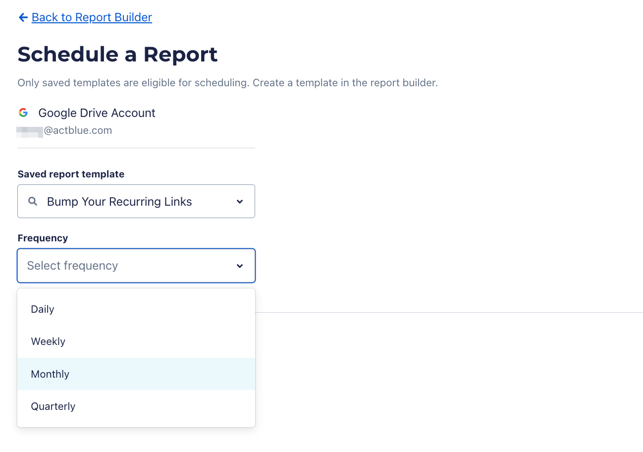 Finally, choose what frequency you'd like for your reports. Reports are sent in the morning and can arrive in your Google Drive as early as the following day. Please note that you can customize the specific date for weekly and monthly reports once you select a frequency.