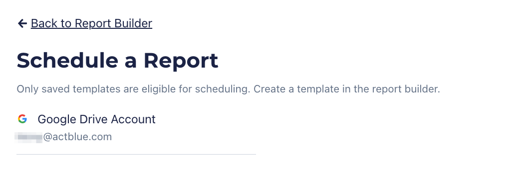 After you select frequency (and delivery date if applicable), a note will appear alerting you when your first report will land in Google Drive. Click the Schedule button to confirm your selections.