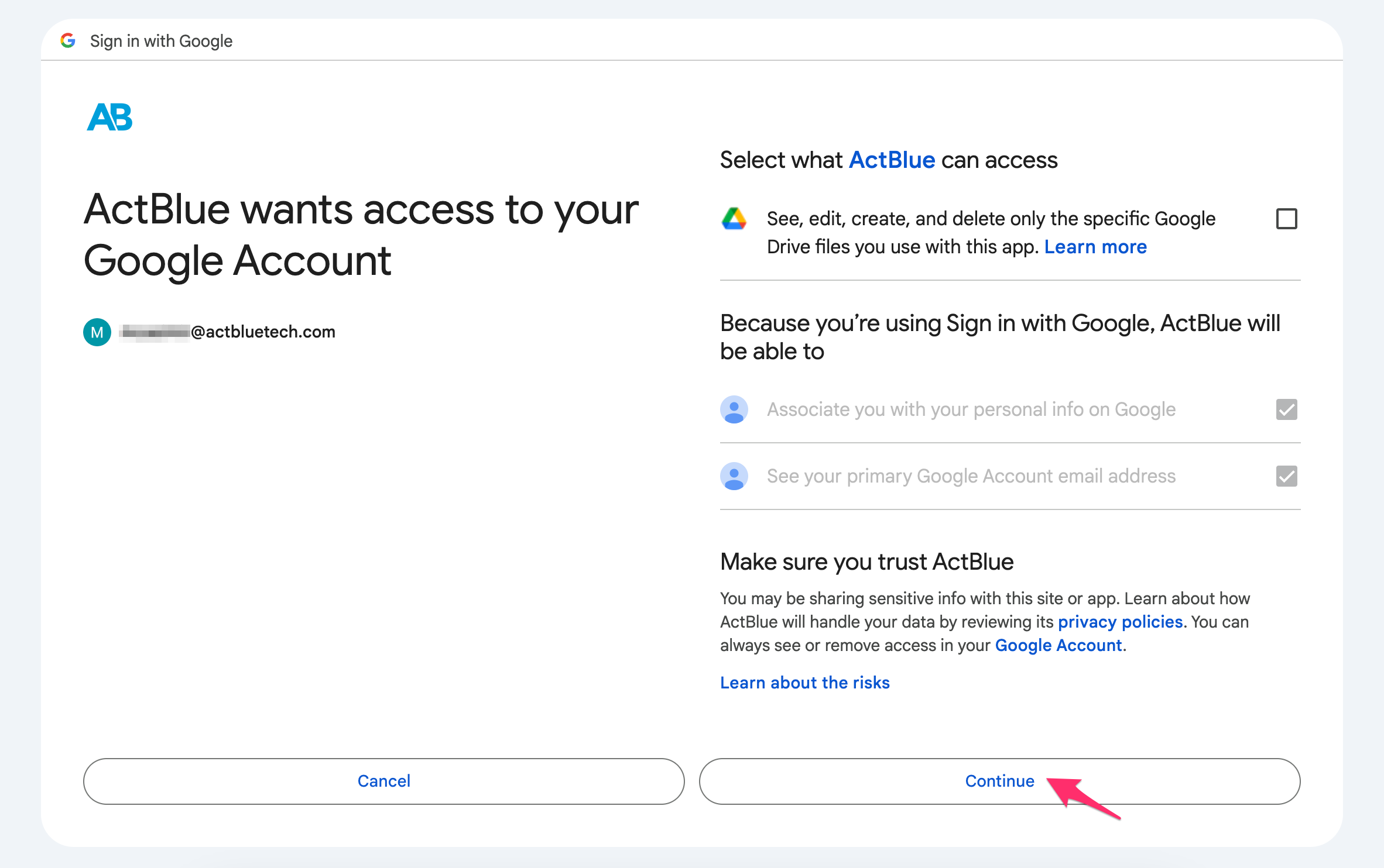 Once you select a Google account, you will be asked whether or not you want to grant ActBlue limited access to your Google account. To confirm, ActBlue will be able to see, edit, create, and delete only the specific Google Drive files you export from ActBlue. ActBlue will not share these files with any other user, and we will not access any other data from your Google account.