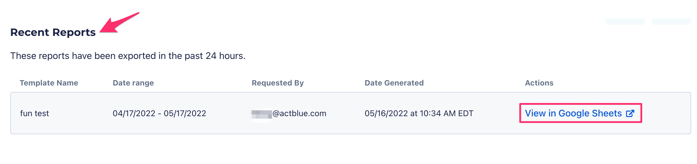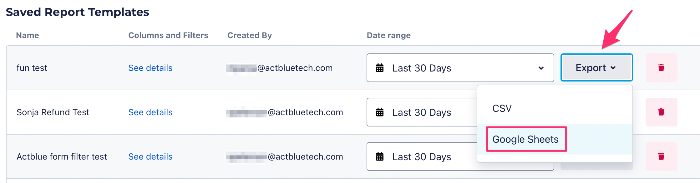 Yes! When downloading reports of fundraising data on ActBlue, you will now have the option to either download a CSV spreadsheet or directly upload your data to Google Sheets.