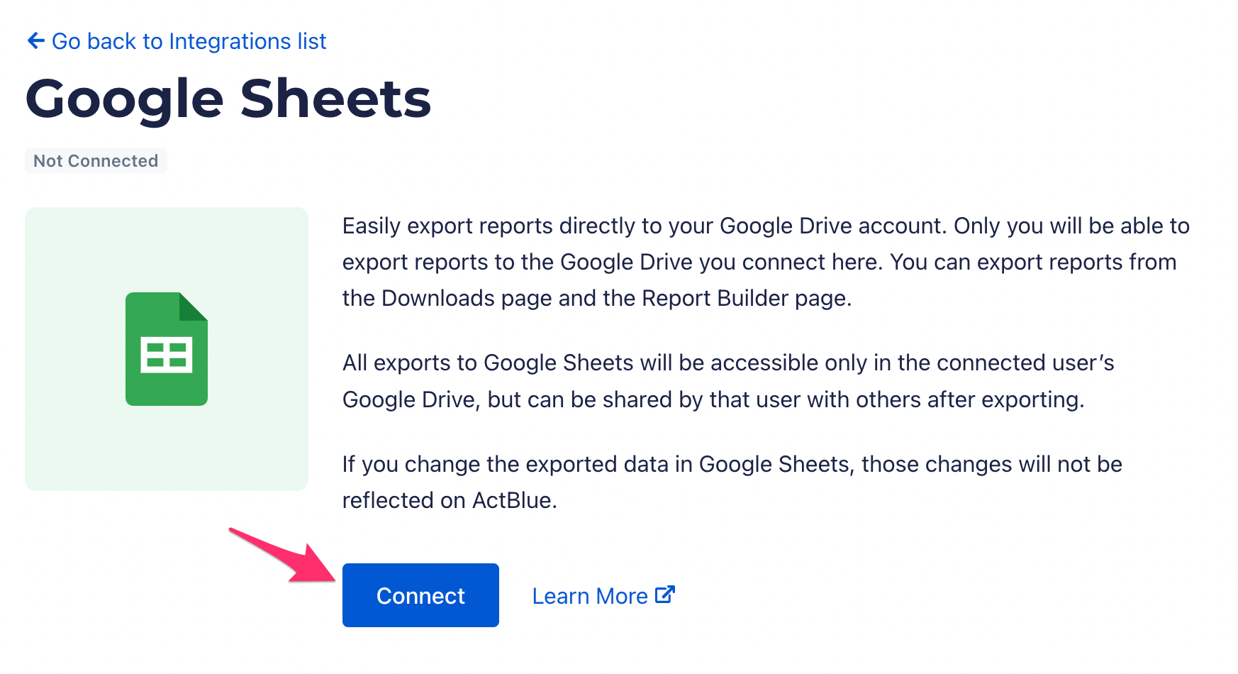 When you set up a Google Sheets integration, you’ll need to sign into a Google account. Anyone who has access to that Google account can access ActBlue reports in your Google Drive.