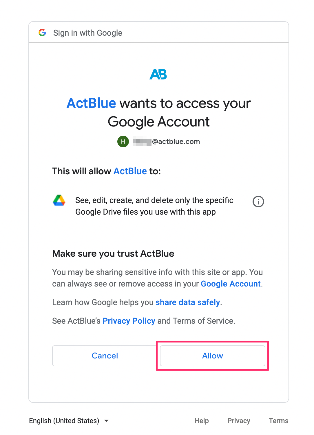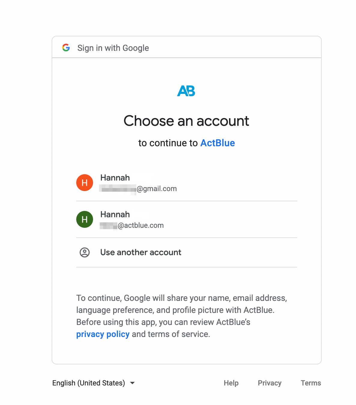 Select the Gmail account that you use to sign in to ActBlue and grant ActBlue permission to access your Google account.