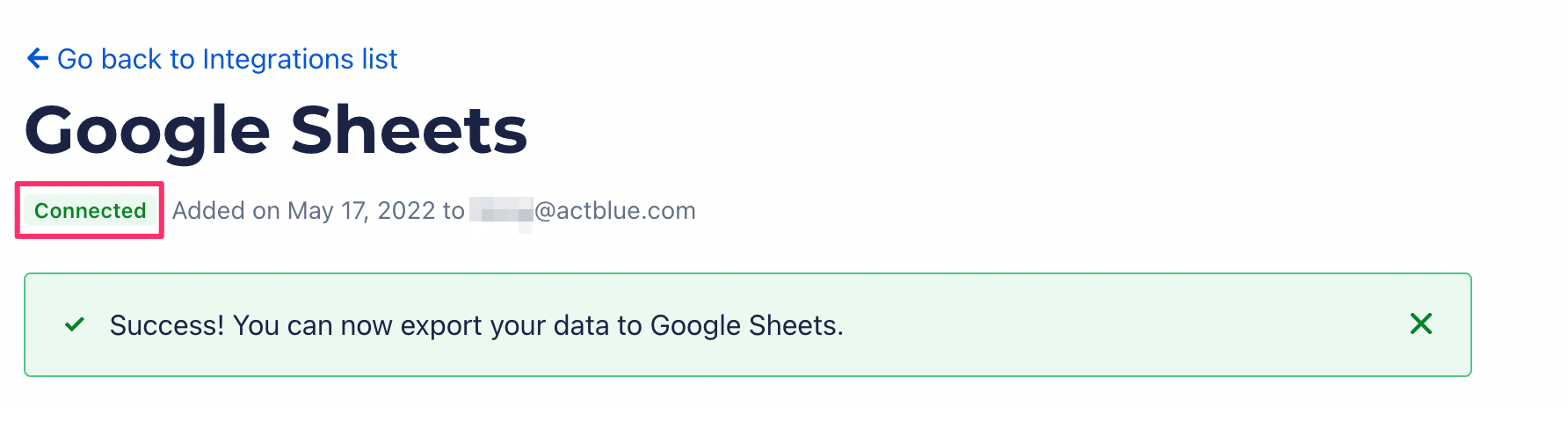 Once you've signed in and granted ActBlue permission to make these changes, you’ll be redirected to the Google Sheets page on ActBlue and will receive a message confirming your integration was successful: