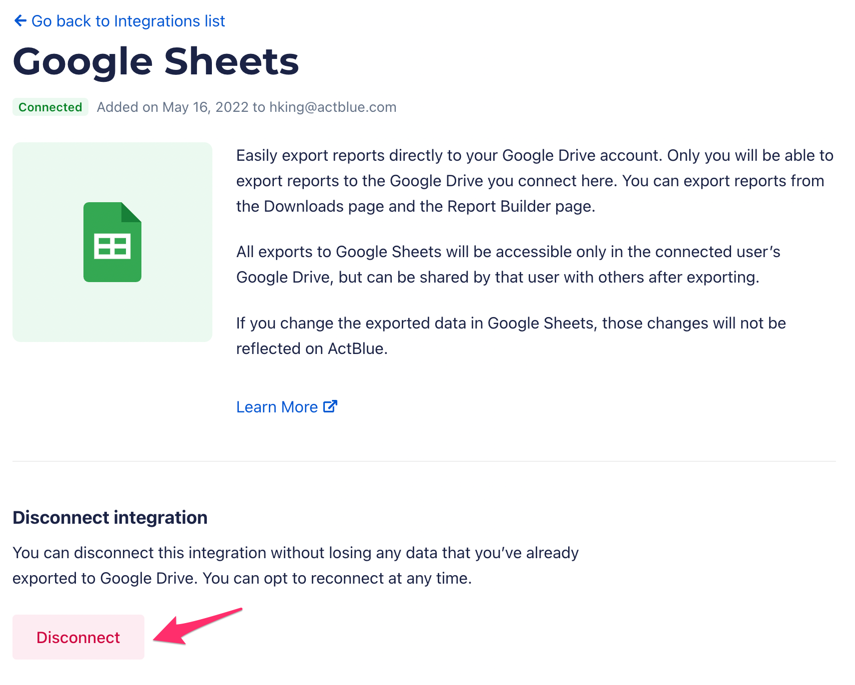 Please note that disconnecting your integration will not delete any reports you've already exported to Google Sheets.