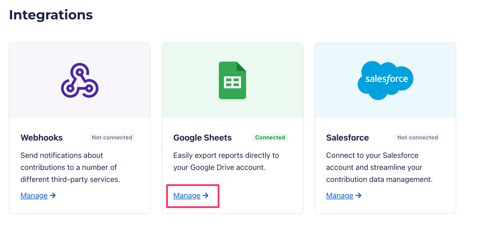 From the Integrations page, locate the Google Sheets section and click Manage: