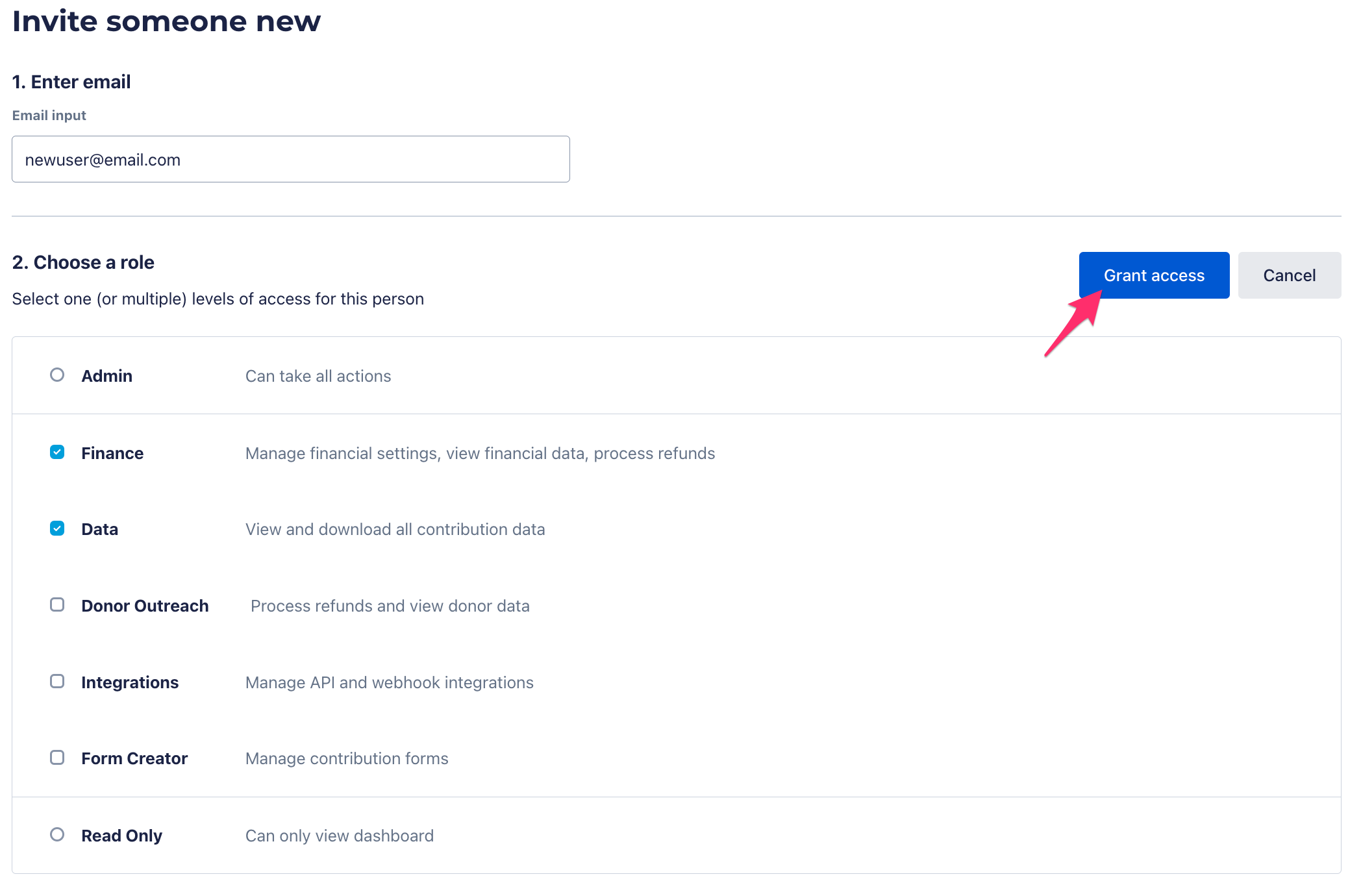 Enter the new user’s email address in the space provided, and then select which user role you want to grant them. Once you're finished, click the blue Grant Access button: