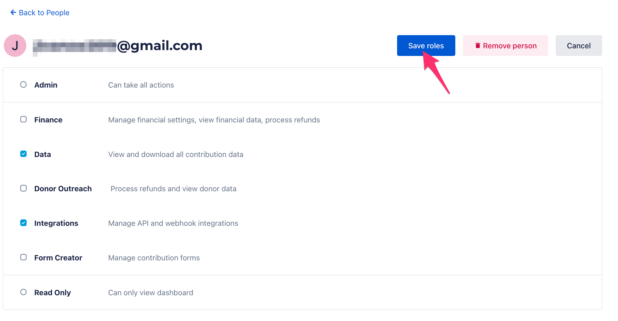 The Donor Outreach role offers similar permissions to the Read Only role with added capabilities to issue refunds and cancel recurring contributions.