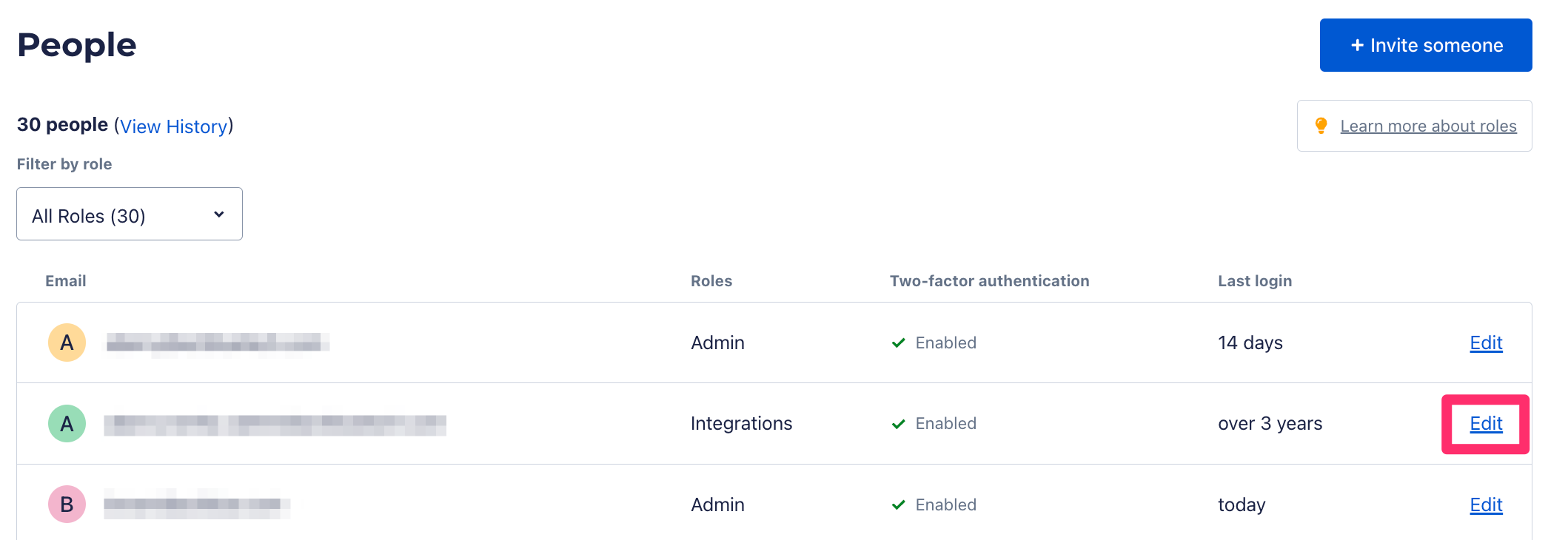 Next, locate the user whose role you'd like to edit and click the blue Edit link beside their email address. This will bring you to their individual user settings page.