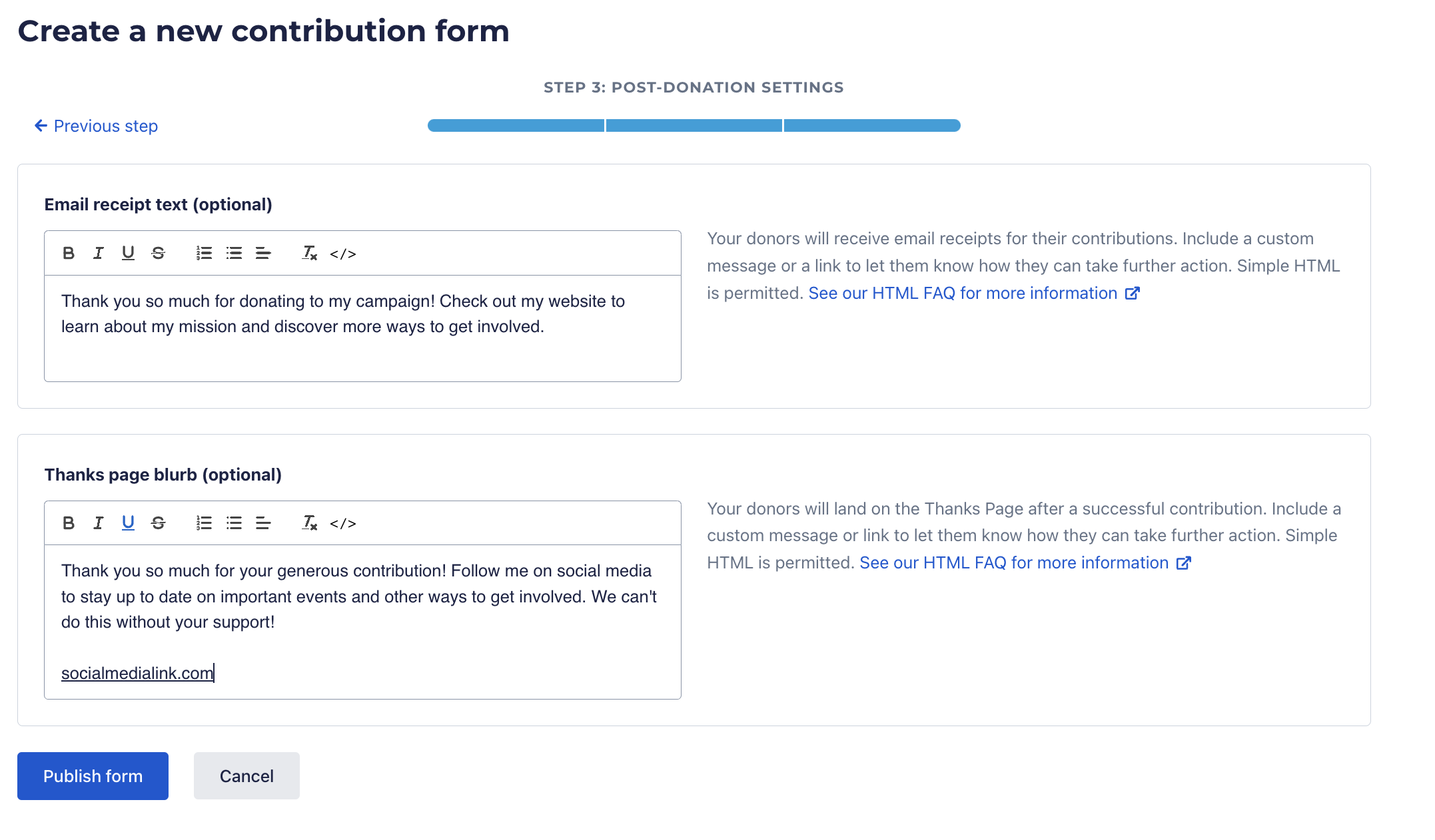 You also have the option to customize the text your supporters will see on the Thanks page that appears after they give on your form. Just fill in your message in the 'Thanks page blurb' box to let them know how much you appreciate their support.