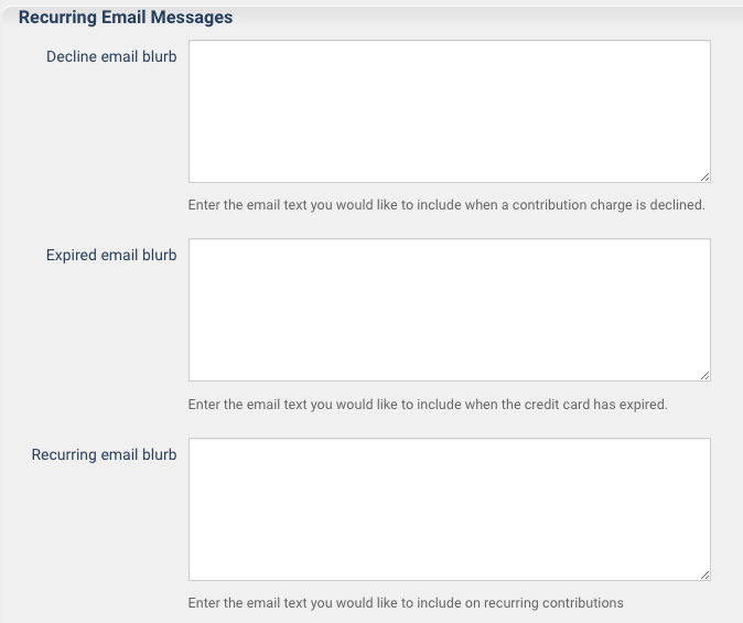 The “Recurring email blurb” is the text you’d like donors to see along with their recurring contribution receipt every month. This is a chance for you to let your donors know how much their continued support means to you.