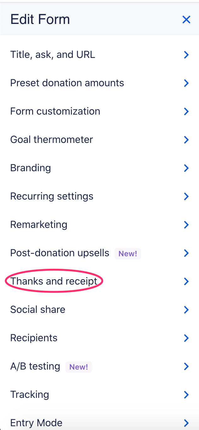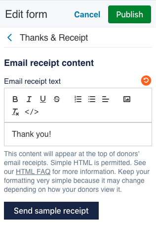 The form editor will be open on the left side of your screen. Select the “Thanks and receipt” tab to customize messages donors see after giving on this specific form.