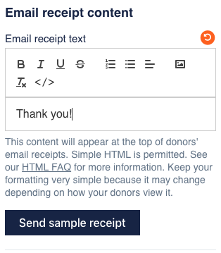 You can add a custom message for donors to see on their email receipt in the “Email receipt text” field.