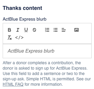 After users without ActBlue Express accounts donate on your contribution form, they'll have an opportunity to sign up for an ActBlue Express account. The “ActBlue Express blurb” is your chance to pitch ActBlue Express to them and get them to convert. Leave them a note letting them know how convenient contributing will be if they save their information and how much you value them taking the time to do so.