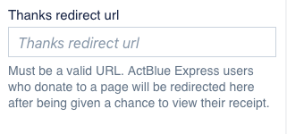 You can also enter a URL here that you want your donors to be sent to after they land on the Thanks page. After contributing, your ActBlue Express users will see a popup that says, “Your contribution succeeded, thanks!” for five seconds before being directed to the page you’ve chosen. This gives you the opportunity to send your donors to an action page on your website, like a petition, or redirect them to a volunteer form and ask them to take the next step in supporting your cause. They’ll still receive their email receipt automatically upon contributing.