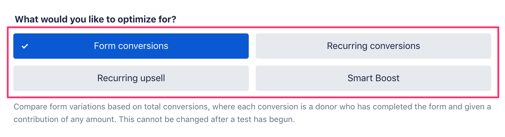 If you select “ Form conversions,” Automatic traffic allocation will direct more traffic to the version of your form that's collecting the most contributions of any amount. If you select “Recurring conversions,” the algorithm will direct more traffic to the version of your form that collects more recurring contributions, whether donors make them on the form during the donation flow or after, through the recurring pop-up upsell. If you select “Recurring upsell,” the algorithm will direct more traffic to the version of your form on which more donors are choosing to start a recurring donation after completing an initial one-time contribution. If you select “Smart Boost,” the algorithm will direct more traffic to the version of your form on which more donors are choosing to increase their initial contribution in the post-donation upsell. You cannot change your optimization after the test begins.