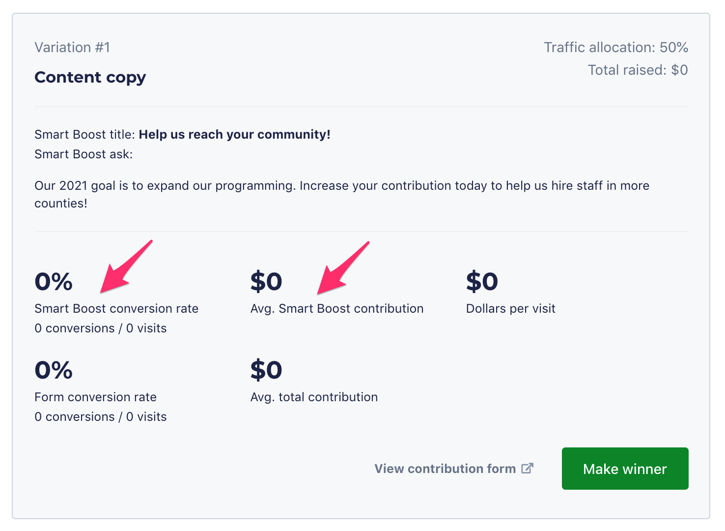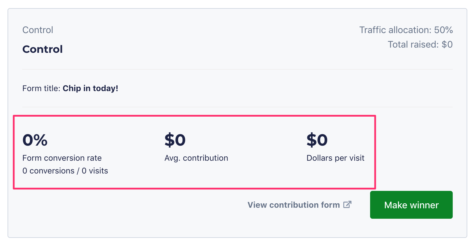 No matter what you optimize your test for, you will always see the form conversion rate (people who donated divided by people who only visited the form), average contribution, and dollars per visit for each version of your form.