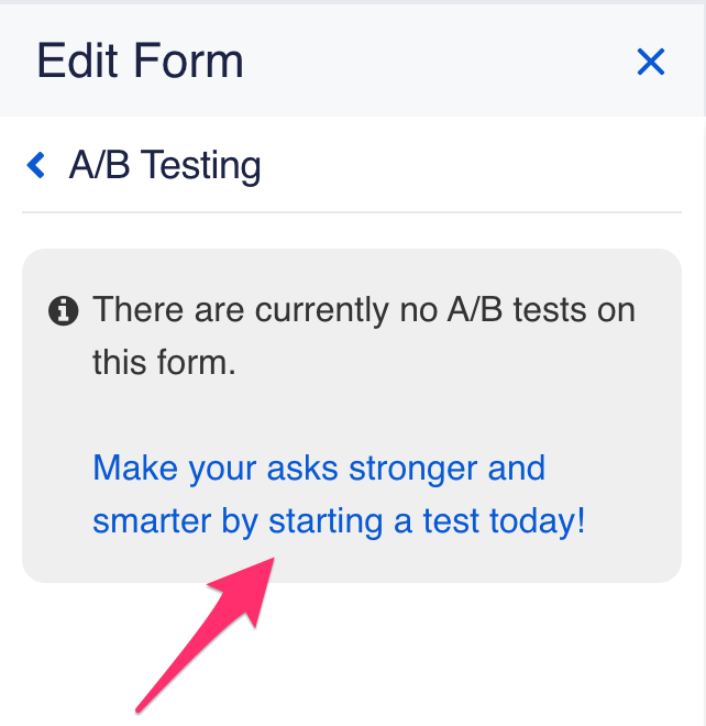 This feature is your variable. Each form version in the test will be the same, except for the variable you choose to test. You can test multiple features simultaneously, but to run the most accurate test, just pick one. That way, you will know the variation caused a difference in visits, contributions, contribution amounts, recurring contributions, or Smart Boost contributions.