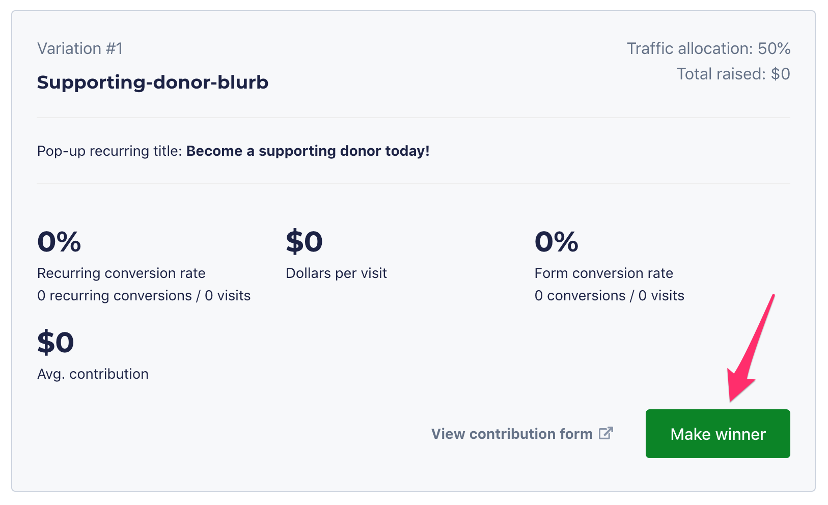 If you did not use automatic traffic allocation, click “Make winner” on the top-performing variation to stop allocating traffic to the less successful form. If you use automatic traffic allocation, the A/B test will do this on its own over time, but if you see a clear winner, you can click “Make winner” to speed up the process.