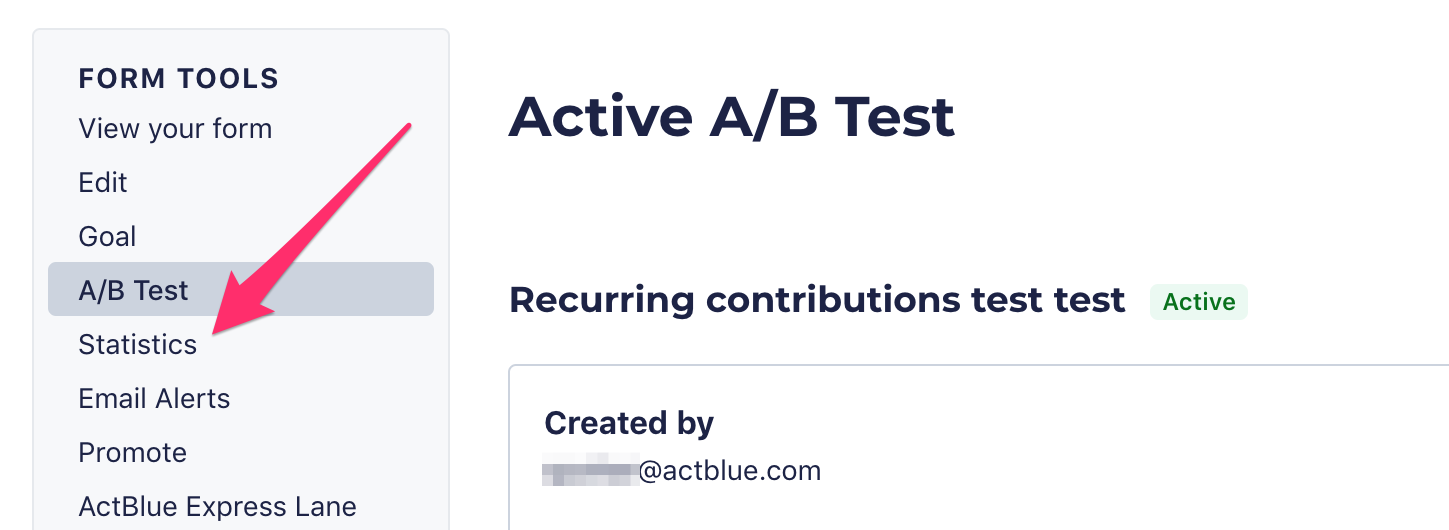 You can find data on your A/B test in the spreadsheet form contributions, which you can find on your form’s Statistics page. Navigate there from the Active A/B Test page while previewing your form or by clicking either the number of contributions or the donation total for your form on the Contribution Forms page of your Dashboard.