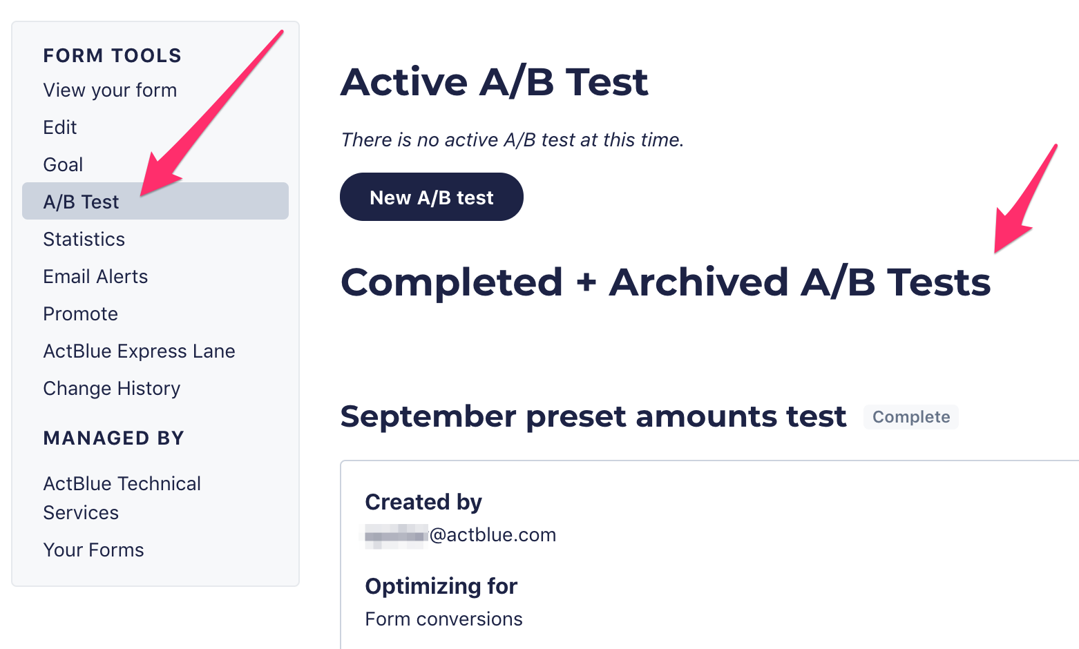 Once you complete your A/B test, either by letting the multi-armed bandit algorithm pick a winner or picking a winner yourself, you can view the results on the A/B test page of your form. You can always navigate to the A/B test page through the link in the form editor or the Form Tools menu.