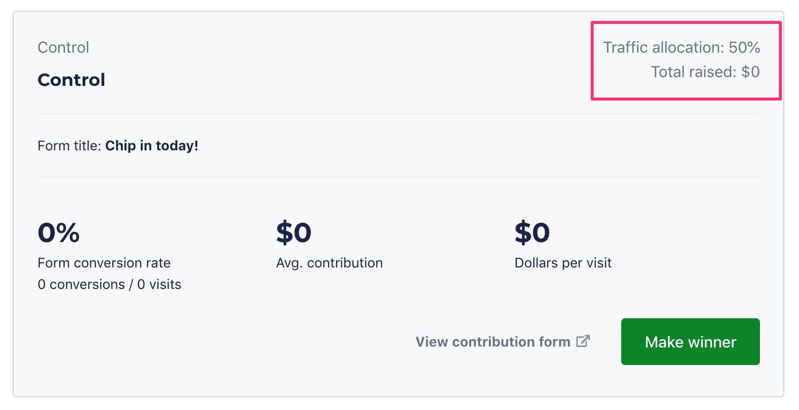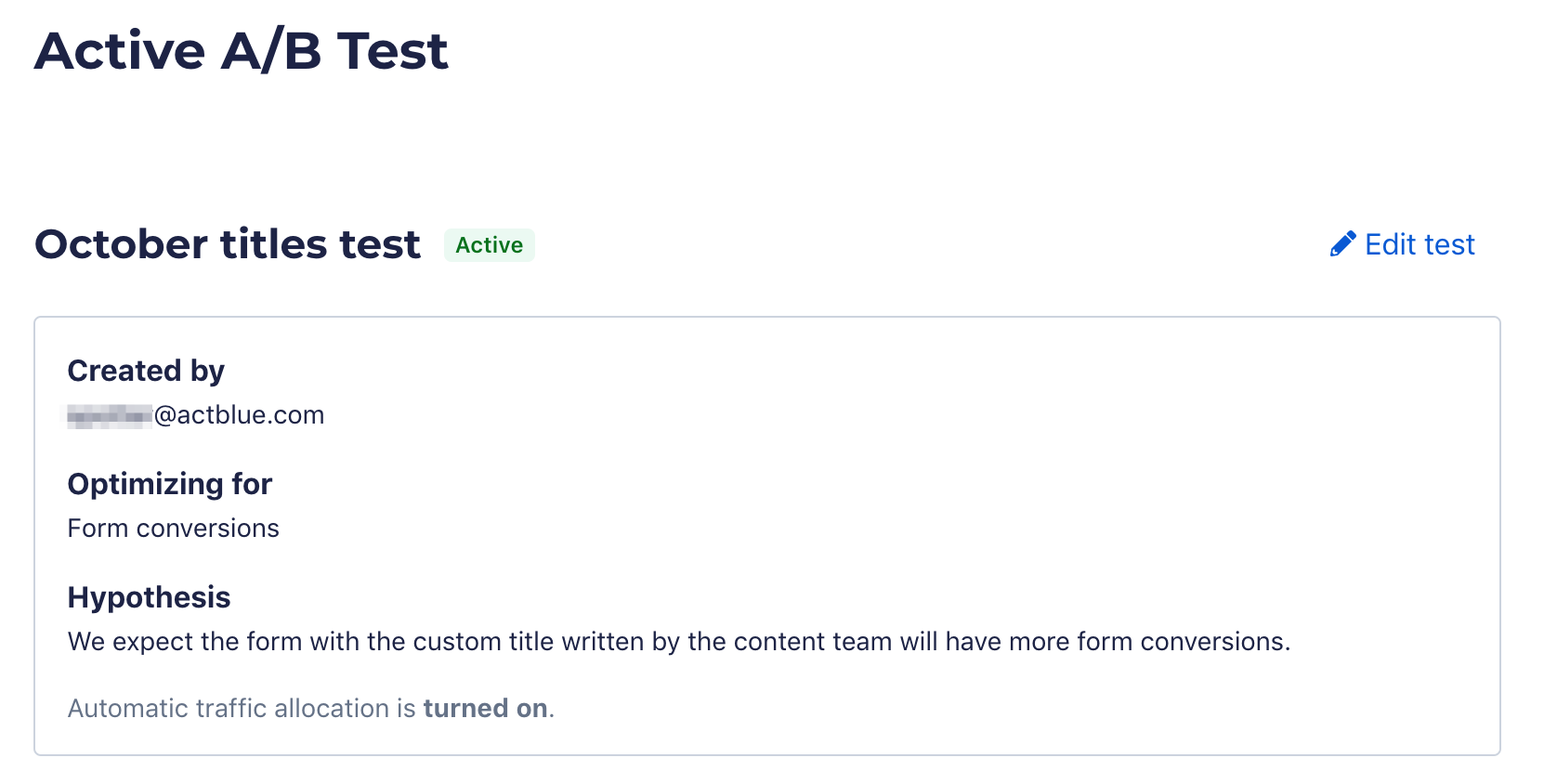 Underneath these two fields, the “Automatic traffic allocation” option will automatically be selected (pictured above). This feature, also known as a multi-armed bandit algorithm, directs more traffic to the version of your form that is performing best. Depending on what you optimize for, you won’t lose out on potential contributions and can still run a sound test. We highly recommend keeping this feature on to run tests and raise funds simultaneously. You can learn more about the multi-armed bandit on our blog .