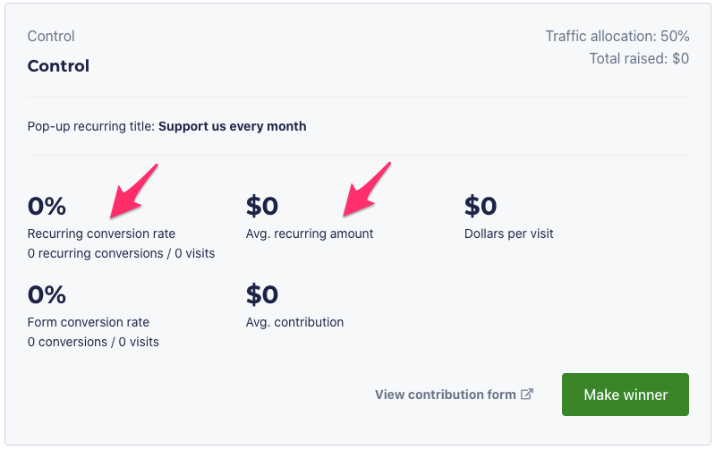 - Recurring conversion rate: percent of donors who visit the form and make a recurring donation during the donation flow or via a pop-up upsell.