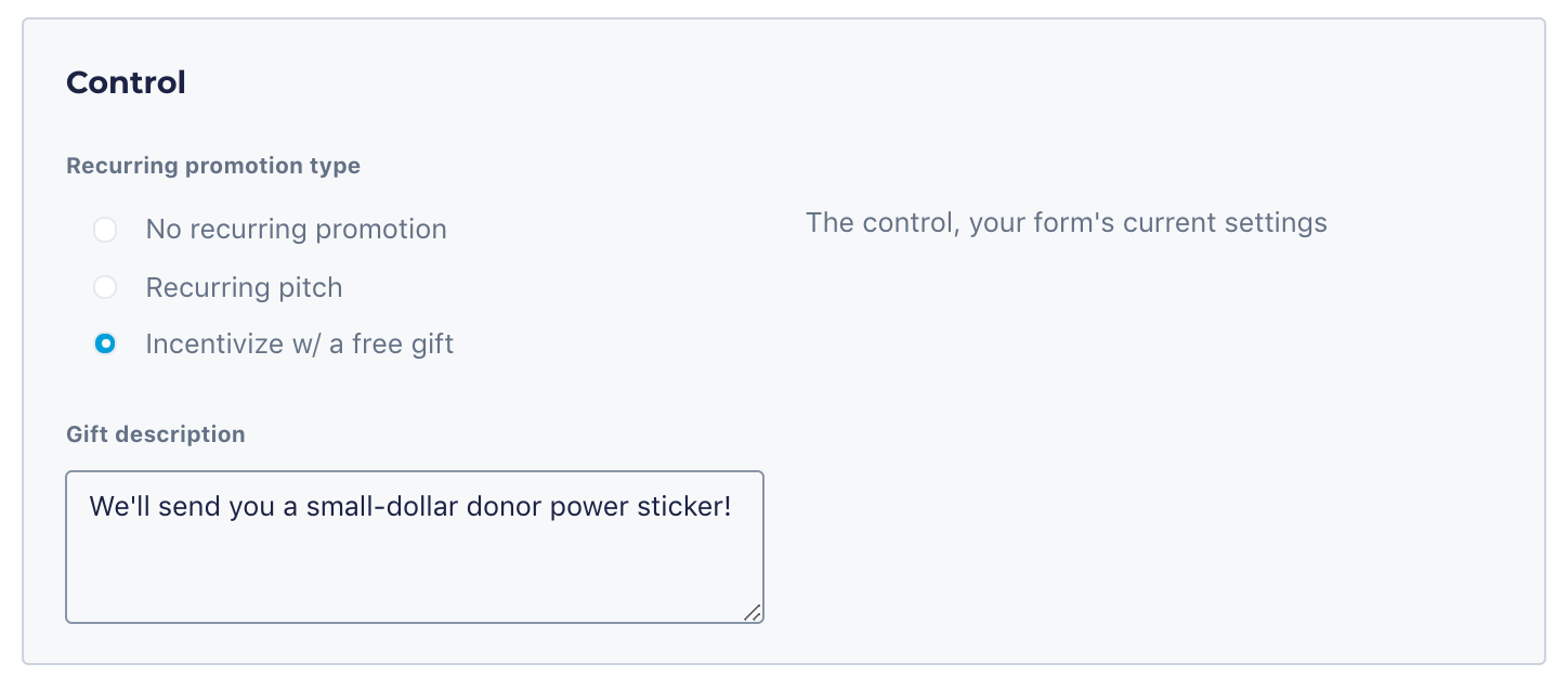 If you choose “Recurring promotion,” you can test different variations of the recurring pitch and recurring incentive tools. The control is your form’s current settings, whether a recurring pitch or incentive (configure both in the recurring settings tab of the form editor).