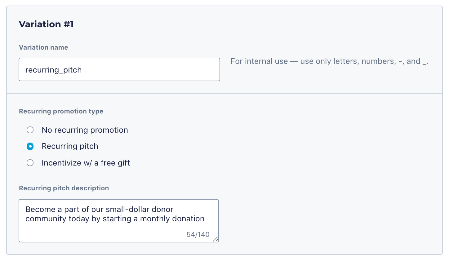 For the variation, you can test a recurring pitch or recurring incentive. That means you can test the same type of recurring promotion with different copy or a different type of recurring promotion.