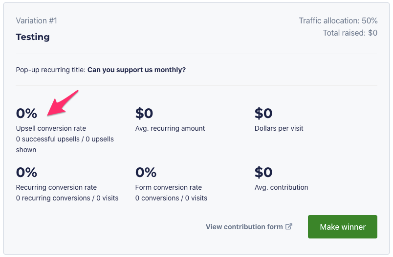 - Upsell conversion rate: percent of donors who see the recurring pop-up after giving a one-time contribution and decide to start a recurring donation