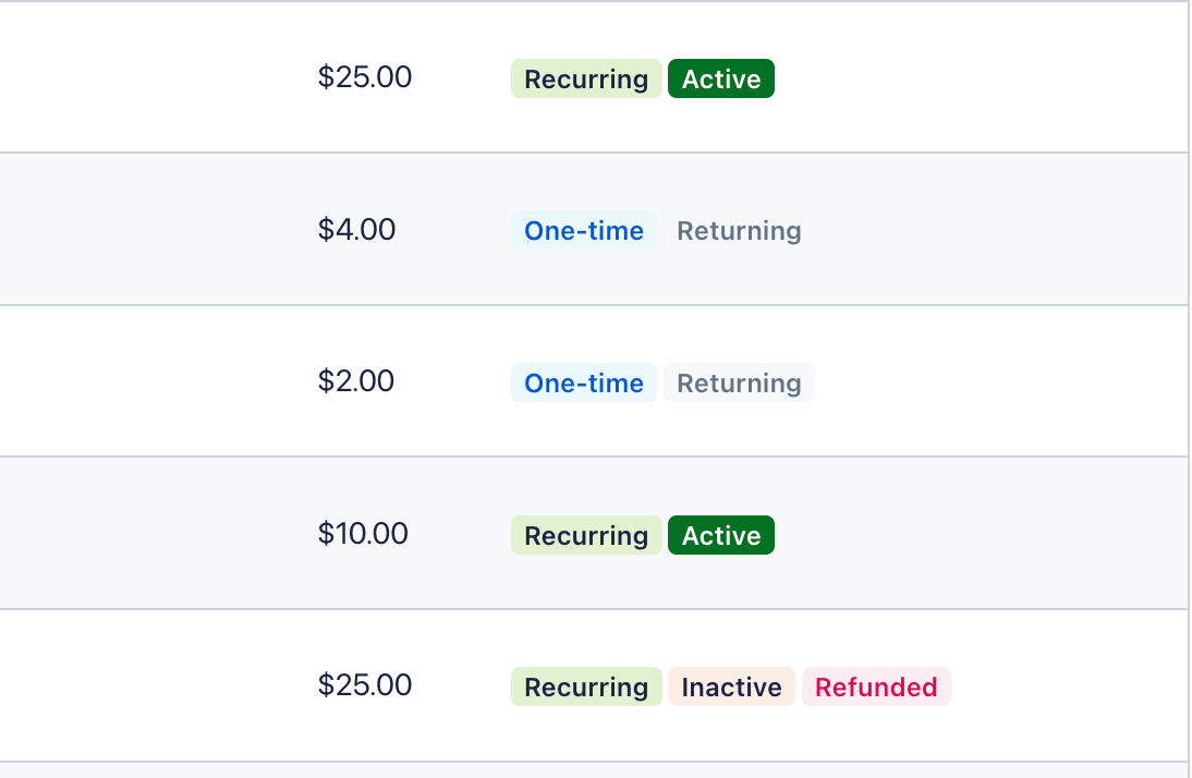 The “Contribution type” column indicates whether the donation is one-time or recurring, if it’s one-time, whether it’s a first-time or returning donor (identified by email address), and if it’s recurring, whether it’s active or inactive. There is also a refunded tag if the contribution was refunded.