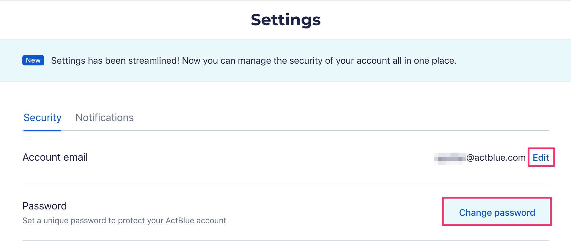 The Security tab will allow you to manage various aspects of your account's security, starting with the email address and password. Please note that you will not be able to change your email address to one that is already registered to another, existing ActBlue Express account.